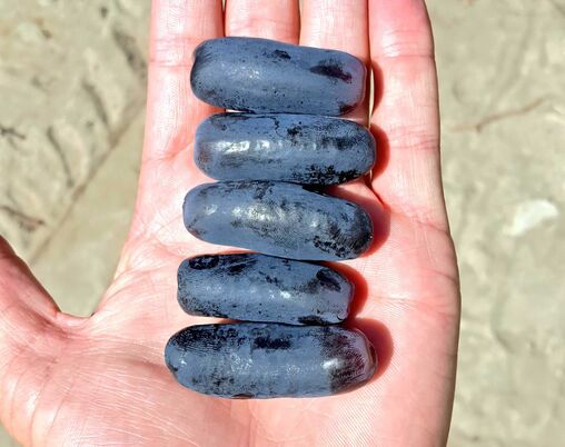 - Ягоды: очень длинные и тонкие, темно-синей окраски, вытянутые, с ямочкой на кончике, размером 20-22 мм х 37-50 мм, весом 7-9 г, при созревании практически чёрные.
